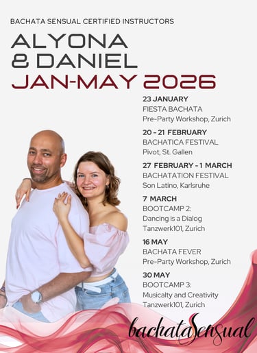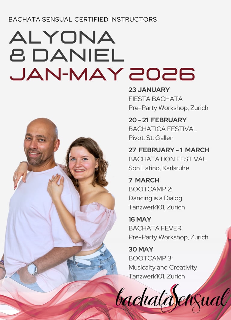 Gemeinsam mit meinem Tanzpartner Daniel aus Zürich unterrichte ich regelmäßig Bachata Sensual Partnerwork Workshops in der Schweiz und in Deutschland.